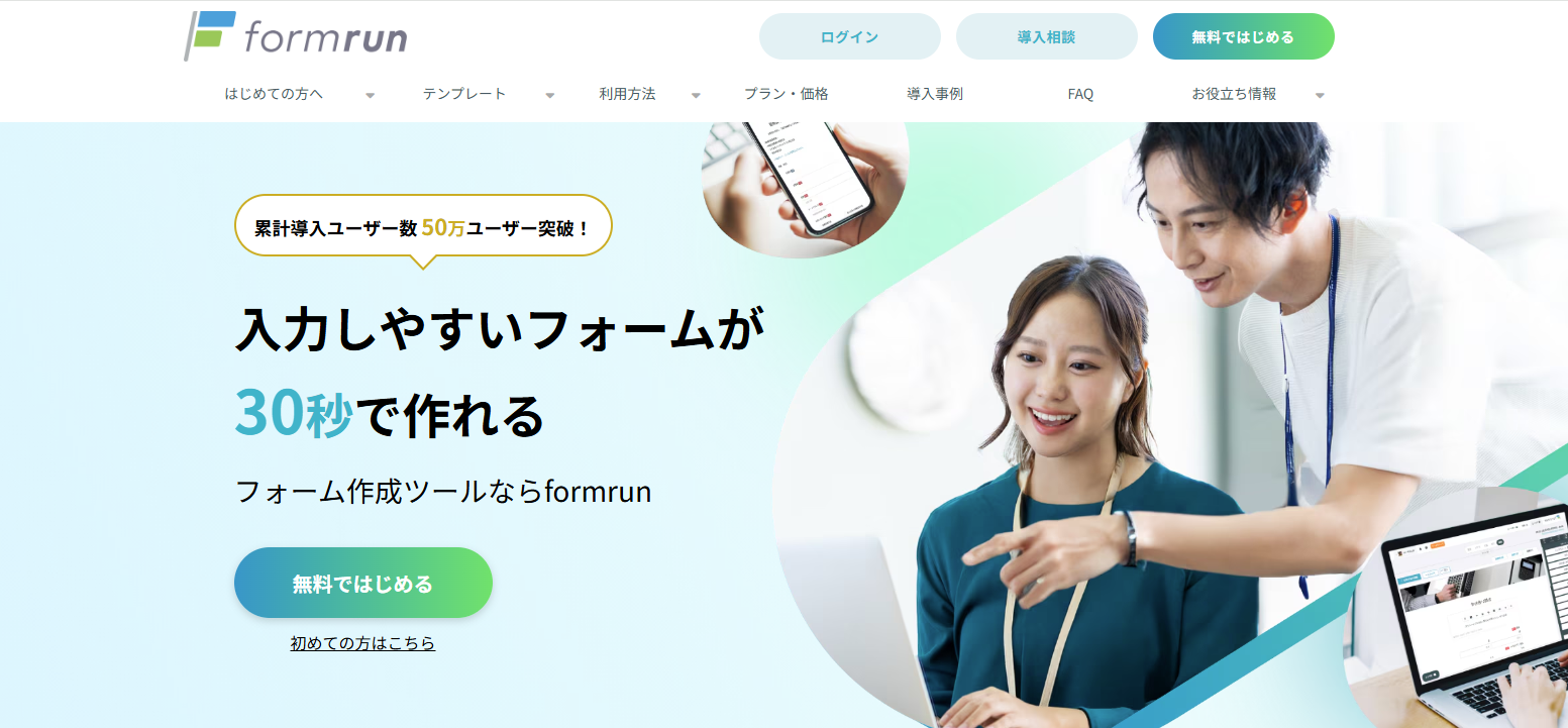 フォームランは、豊富なテンプレートと直感的なフォーム作成が特徴的なメールフォーム作成ツールです。40種以上のテンプレートが用意されているので、メールフォームの作成が初めてという場合でも簡単に作成が可能です。
