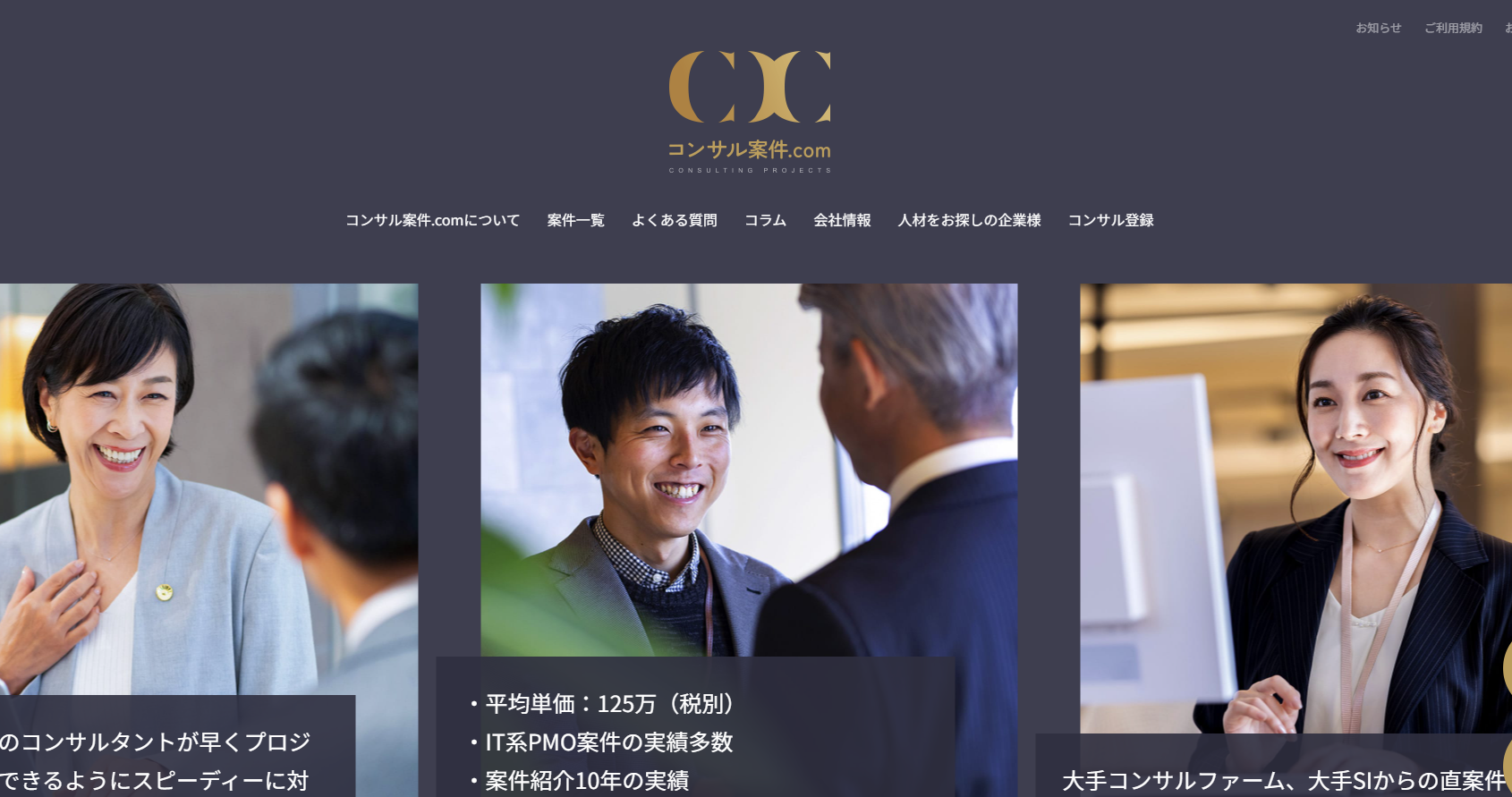 サイト内では、案件獲得のポイントやフリーランスとしての働き方、IT最新動向などのコラムも発信しており、案件紹介と情報提供の両面からフリーランスコンサルタントをサポートするサービスです。